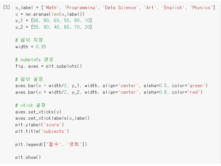 axes.set_xticklabels(x_label)xticks를 설정할 때 x(배열로 된 리스트)를 먼저 지정하고 레이블 넣어준다.