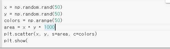 여기서 colors 변수에 50까지의 순차적인 값을 넣고 , area 변수는 x와 y 곱에 1000을 곱한 값을 넣어주고 이를