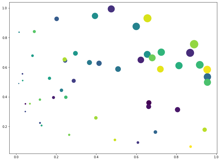 각각 색(s)과 크기(c)에 넣어준다. 이것을 해보는 이유는 위의 산점도와 달리 랜덤 값으로 색과 크기를 가진 산점도를 볼 수 있기 때문이다.